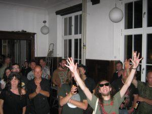Spacelords were pretty fast and start at 21:55 and played just about an hour. The crowd really enjoyed them and there were a lot of people now. Such nice people. I like to talk and hang out with them. IT is a really good band. By the time they finished the place was really packed with people. 150-200 people I guess. Wow. ØSC was on as fast as we could. We were not very happy with the sound guy at this gig. He was just not into being there. Always on his phone or outside smoking and we could not get a really good monitoring to play at our best. I think we started like 20mins after 23 and played until 01 and then we took a break and had another short jam that was stopped when the police came by but then we had one more. The recorder shows 2hrs 20mins with the breaks so about a 2hr show. Very intense one. Tim was the man once again. Powerhouse. I was not satisfied with my playing at all because the monitor situation it was hard to hear everyone well. Mogen often turns himself up way too loud when he uses the Nord Modular and also his new modular set up and drowns out the whole band in the monitor. If the sound guy is not paying attention, it must end up being the loudest thing you will hear on the PA. Hot, tired… crap show for me. I crashed out about 02. Told Patrick we sort out the GEMA and money in the morning. Supposed to get 500€ total for both bands.